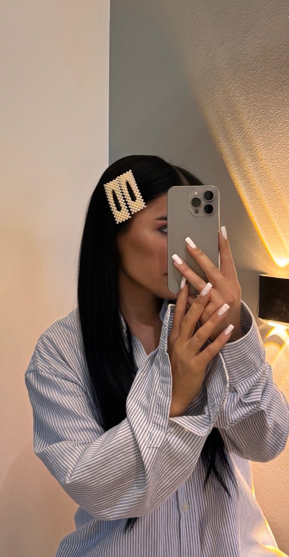 Beyaz renkte, boncuk, inci detaylı saç Tokası sokak stili tasarıma sahip telefon kapağı.
