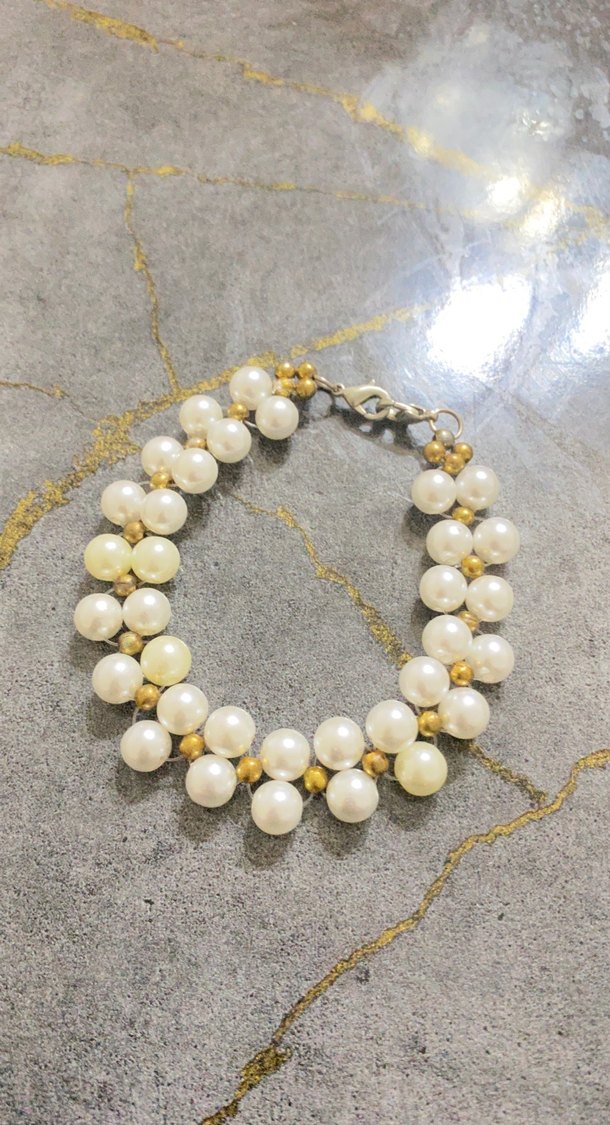 Beyaz boncuklar ve küçük altın detaylarla bezenmiş, klasik ve zarif görünümlü, düğünler için uygun boncuklu bileklik. Bohem tarzda, göz alıcı.