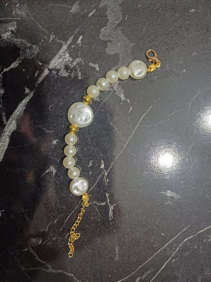 Yuvarlak ve düz boncuklar ile altın detaylara sahip beyaz boncuklu bileklik, günlük kullanıma uygundur. Marka temsilidir