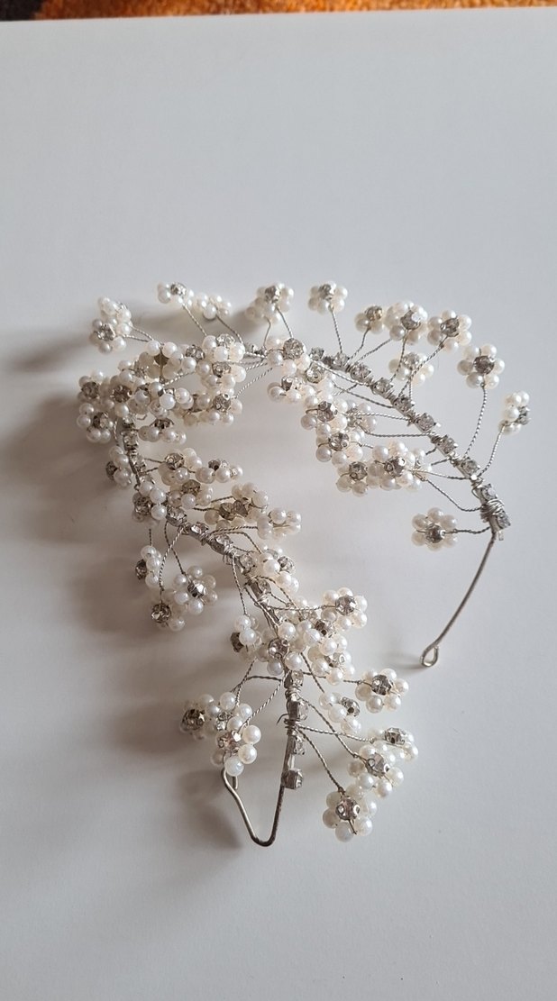 Beyaz cam boncuklarla süslenmiş, gri tabanlı, çağdaş ve minimalist tasarıma sahip kadın saç aksesuarı. ✨