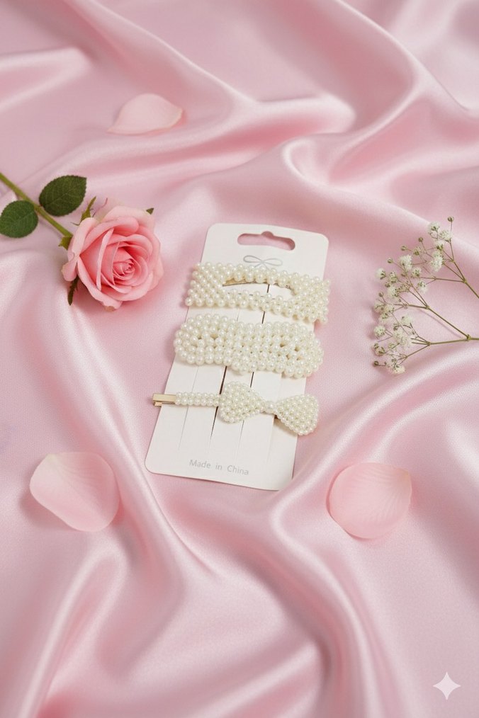 Beyaz boncuklarla süslenmiş, farklı şekillerde tokalardan oluşan, sade ve bohem tarzda plastik saç tokası seti.
