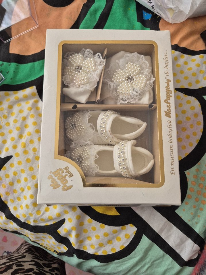 Beyaz plastikten yapılmış, işlemeli desenler ve boncuk detaylarıyla klasik görünümlü kız çocuk özel ayakkabısı.