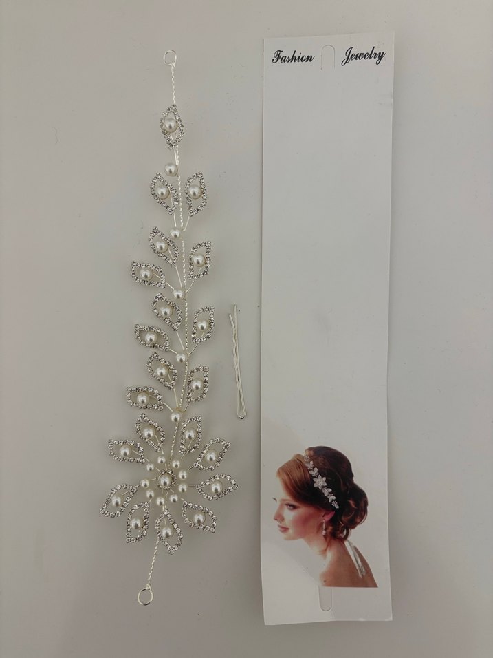 Beyaz metalden yapılmış, boncuklu yaprak desenli saç aksesuarı klasik şıklık katar. Kolay kullanım için toka ile birlikte gelir.