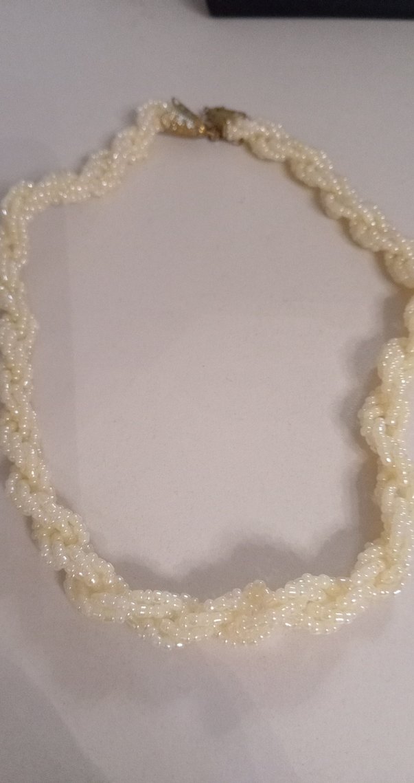 Beyaz boncuklu, bükümlü tasarıma sahip vintage bohem tarzda midi uzunlukta kadın kolye. Düğünler için uygun, hafif ve zarif bir dokunuş katıyor.