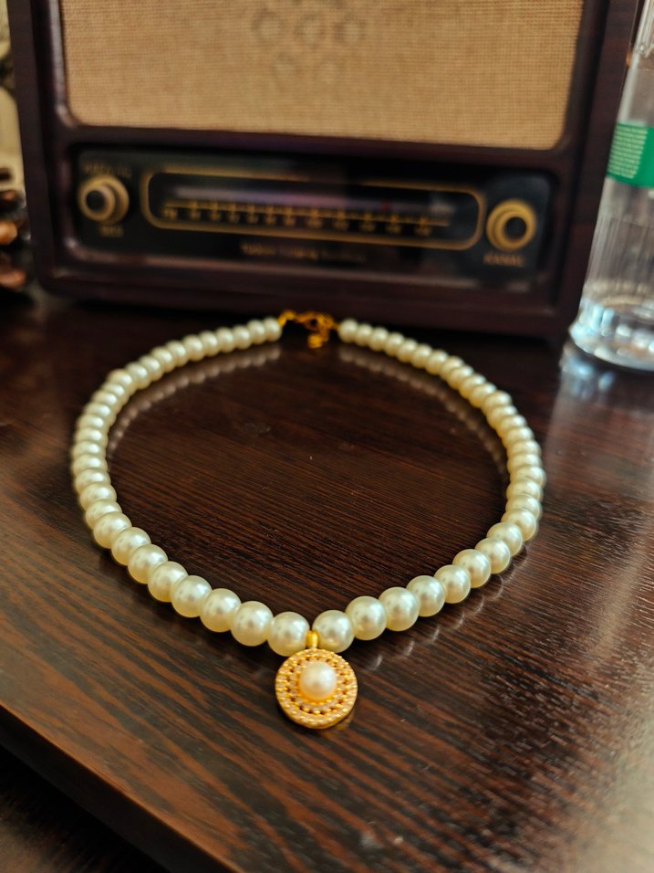 Altın detaylı kolye ucu ile beyaz boncuklardan oluşan midi uzunlukta klasik tasarımda kolye. Hiç kullanılmamıştır, yurt dışından geldi ancak tarzım olmadığı için geldiği gibi duruyor.. Kutu içerisinde gönderilecektir.