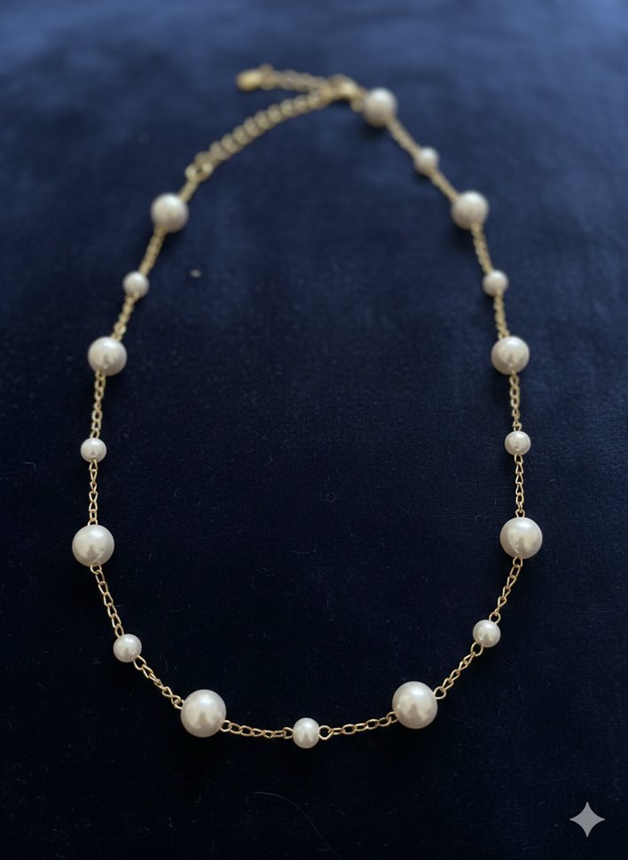 Kadınlar için beyaz boncuklu, ince zincirli midi uzunlukta klasik ve bohem tarzda kolye. Günlük kullanıma uygun şık bir aksesuar.