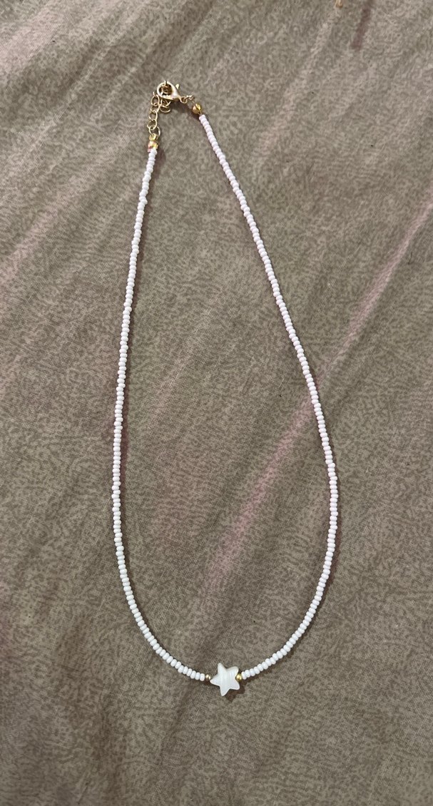 Beyaz boncuklardan oluşan, nakışlı yıldız detaylı, sade ve bohem tarzda midi uzunlukta kolye. Günlük kullanıma uygun.