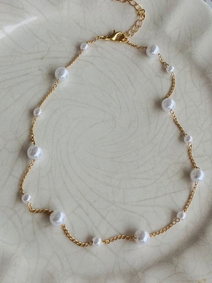 Bohem tarzda, beyaz boncuklu ve altın zincirli midi uzunlukta, günlük kullanıma uygun sade tasarımlı kolye.