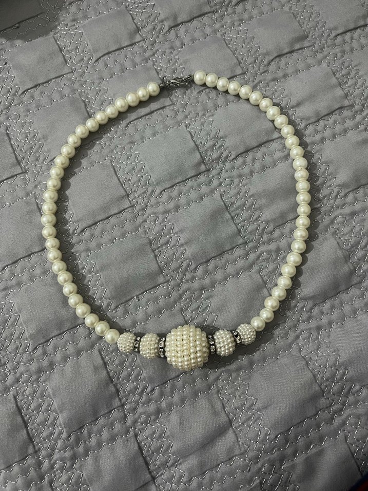 Beyaz boncuklardan oluşan, nakış detaylı vintage tarzı midi uzunlukta kolye. Günlük kullanıma uygun, bohem ve klasik şıklıkta.