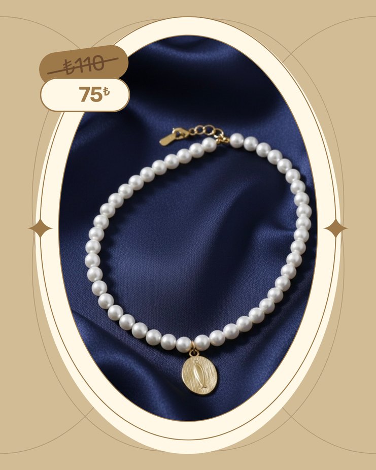 Beyaz boncuklardan oluşan midi uzunlukta, nakış desenli ve küçük altın bir kolye ucu taşıyan klasik kolye.