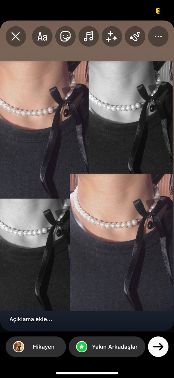 Beyaz boncuklardan oluşan ve siyah kurdele detaylı Parisian gotik kolye, günlük kullanıma uygun şık ve özgün bir tasarıma sahiptir. Midi uzunluktadır.