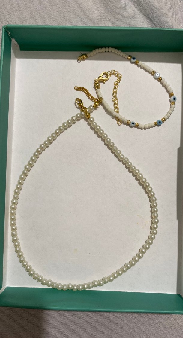 Beyaz tonlarda, kısa uzunlukta iki adet boncuklu kolye seti. Biri inci görünümünde, diğeri renkli boncuklu ve yılan desenli. Altın renk kapama ile günlük kullanım için uygun.