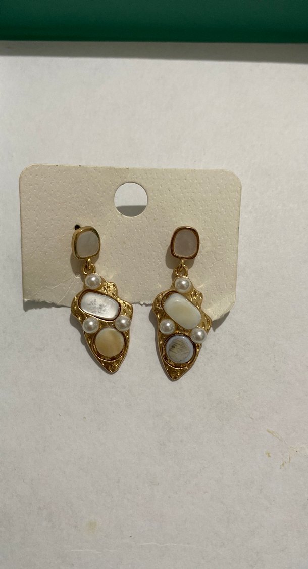 Kısa uzunlukta, beyaz etnik desenli boncuklu vintage bohem tarzda küpeler. Düğünler için uygundur.