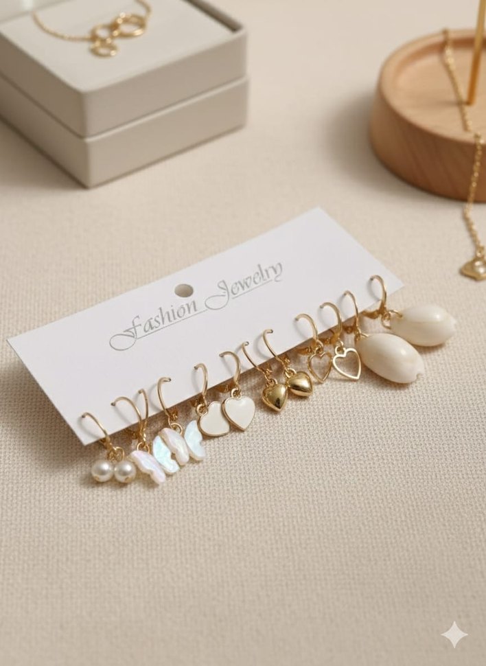 Kısa, parlak beyaz boncuklu ve nakış detaylı bohem tarzda küpe seti. Minimalist ve retro stiller için uygun, düğünlerde tercih edilir.
