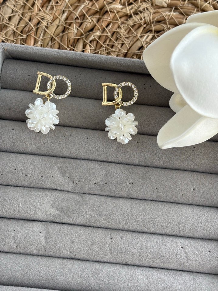 Kısa beyaz boncuklu, çiçek desenli küpeler. Minimalist ve çağdaş tarzda, düğün için uygun, klasik zarafet sunar.