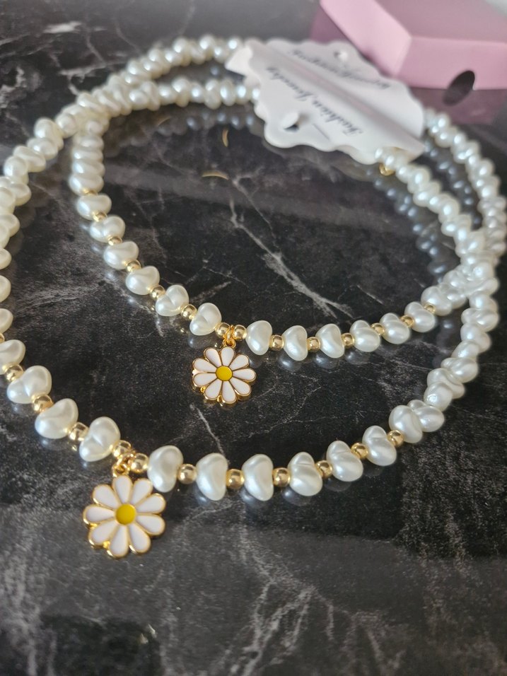 Kısa beyaz boncuklardan oluşan, papatya çiçeği figürlü bohem ve ışıltılı günlük kullanım kolyesi.