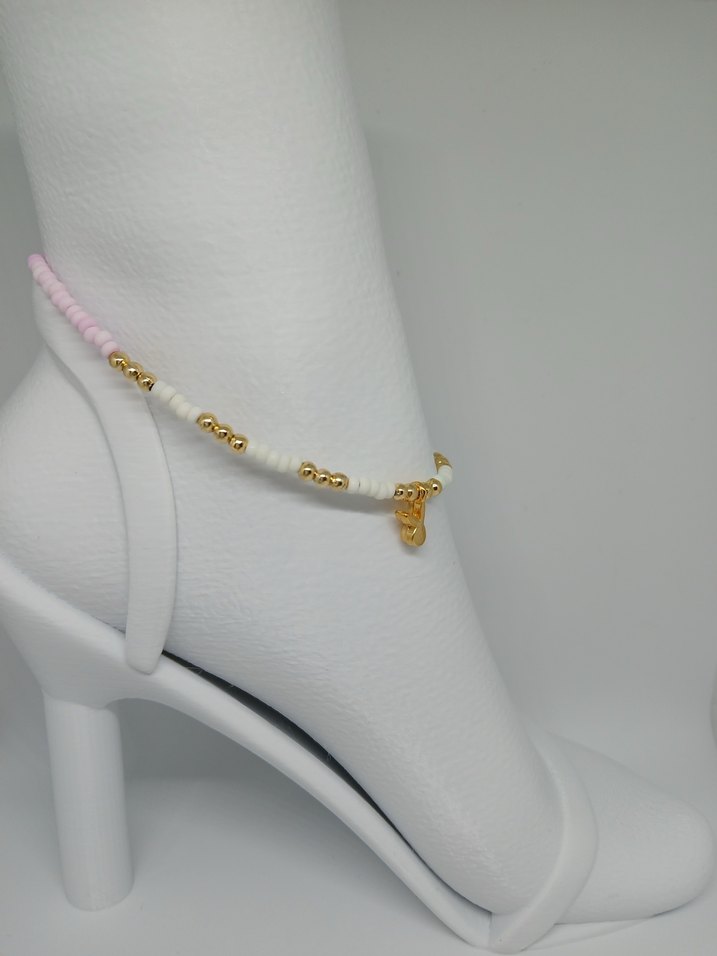 Pastel pembe ve altın boncuklarla bezenmiş beyaz boncuklu, minimalist halhal. ✨
