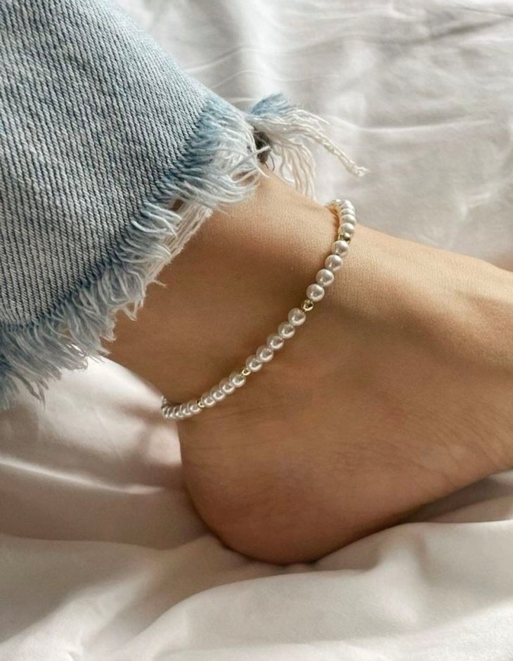 Minimalist ve bohem tarzda, beyaz boncuklu halhal. Günlük kullanıma uygun, hafif ve desensiz tasarım sunar.