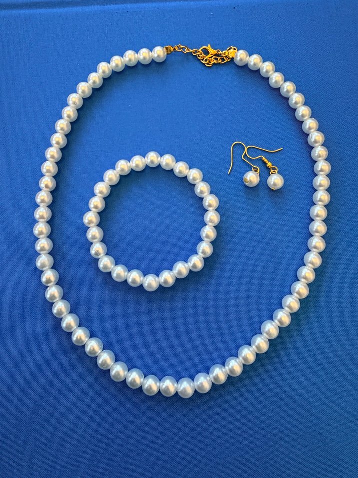 Beyaz boncuklardan oluşan, günlük kullanıma uygun minimal tasarımlı normal uzunlukta kolye, bileklik ve küpe seti.