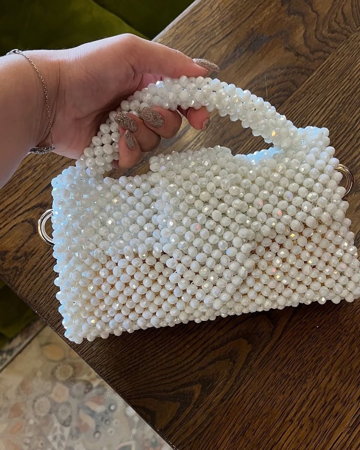 Beyaz boncuklu örgü malzemeden yapılmış, bohem tarzda, günlük kullanıma uygun minimalist ve desen içermeyen kadın çantası. Kristal boncuk ile örülmüştür iç astar yoktur.