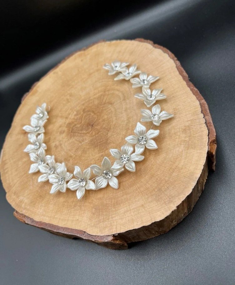 Beyaz ve parlak boncuklu çiçek detaylarına sahip, minimalist tarzda saç aksesuarı.