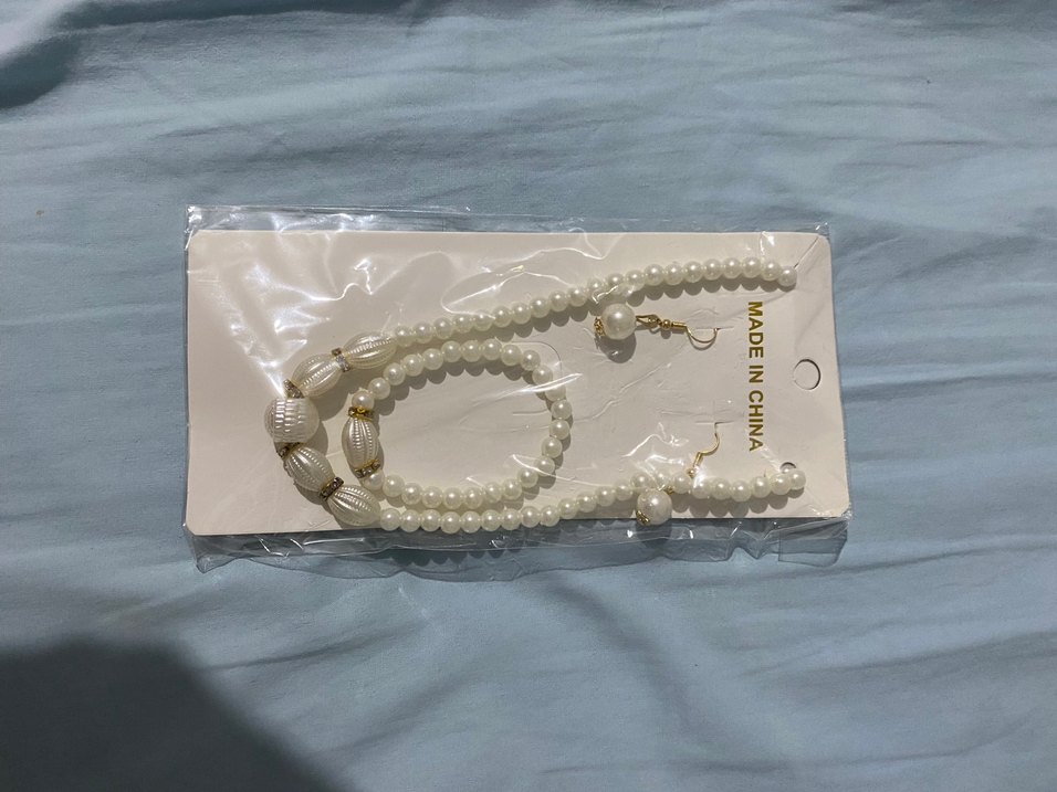 Uzun beyaz boncuklu, sade bohem tarzda kadın kolyesi ve uyumlu küpeler. Günlük kullanıma uygundur. Hac takısı