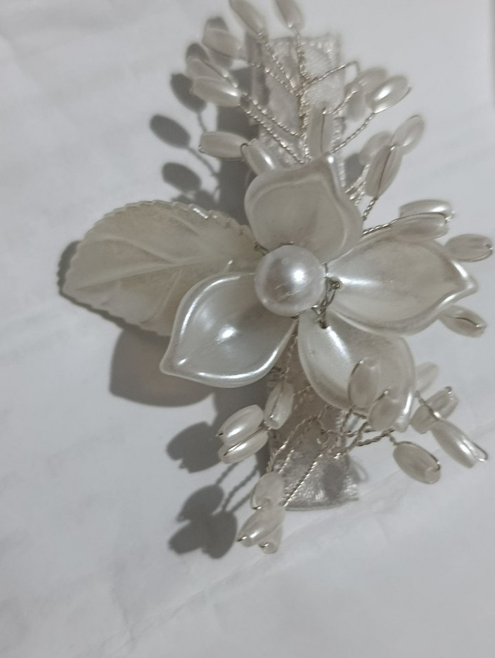 Klasik zarafeti yansıtan, boncuklu ve plastik detaylı beyaz vintage bohem saç aksesuarı.