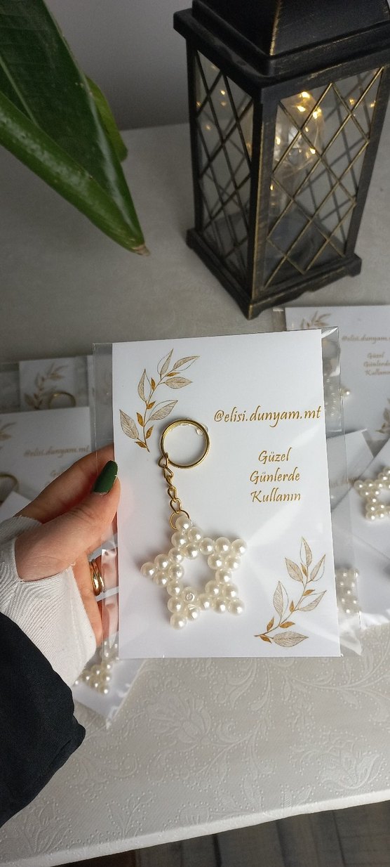 Modest Paris tarzını yansıtan konvansiyonel beyaz boncuklu yıldız şeklinde anahtarlık. ✨