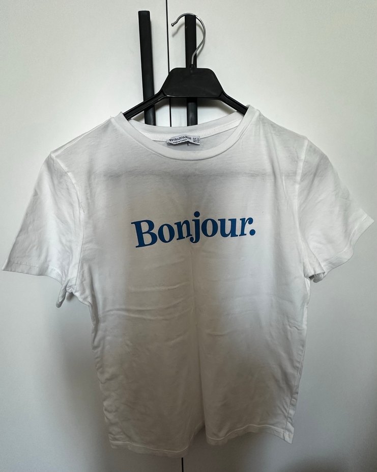Beyaz pamuk tişört, kısa kollu ve yuvarlak yakalıdır. 'Bonjour.' baskısı ile rahat ve şık bir tarz sunar. XS beden. Ürün bir kere giyilmiştir.