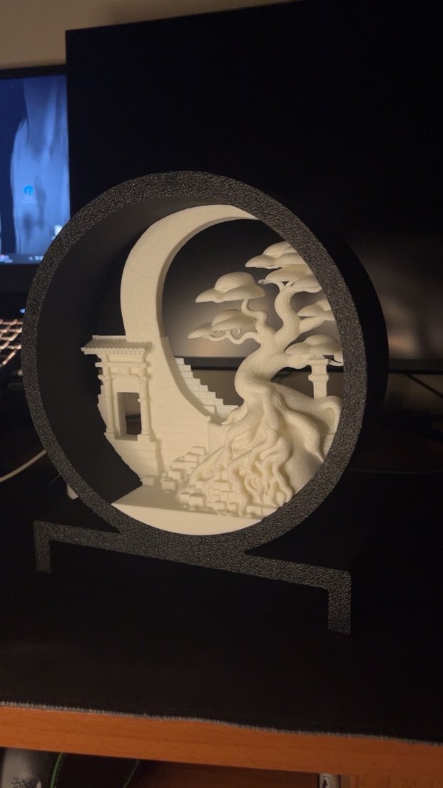 Dairesel çerçeve içinde bonsai ağaç ve mimari detaylar içeren beyaz dekoratif figür.
