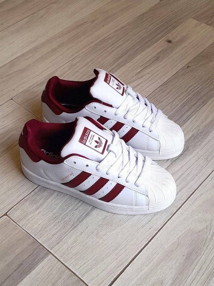 Beyaz tabanlı, bordo baskılı şeritlere sahip kadın spor ayakkabısı. Düz taban ve kauçuk malzeme ile spor ve günlük kullanım için uygun.