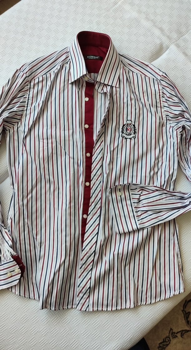 Beyaz lacivert Bordo tonlarında çizgili ve düğmeli, uzun kollu erkek gömleği. Normal kesim ofis ve günlük kullanım için uygundur.