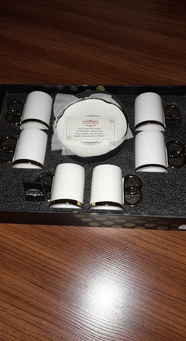 Gümüş bordürlü beyaz seramikten üretilmiş, altı fincan ve uyumlu bir tabağı içeren kahve fincanı seti. ☕