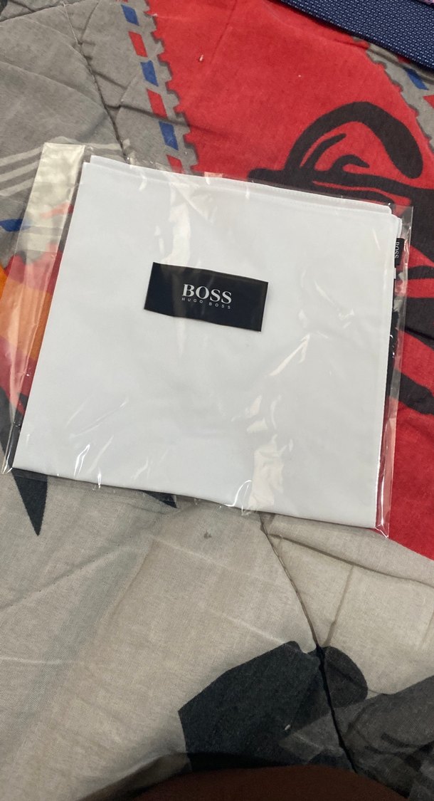 Baskılı BOSS logosu bulunan beyaz erkek mendili, sokak modası ve iş tarzını birleştirir.