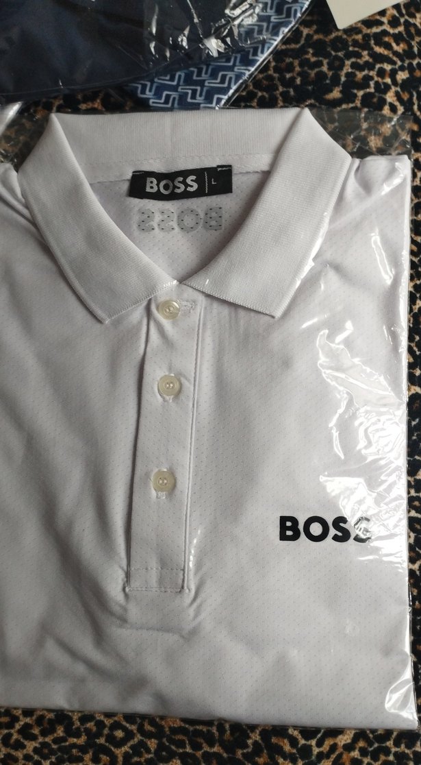 Beyaz renk, yakalı ve düğmeli Boss erkek polo tişört. Baskılı logo ve kısa kollu, sentetik kumaştan, günlük kullanıma uygun, dar kesim.