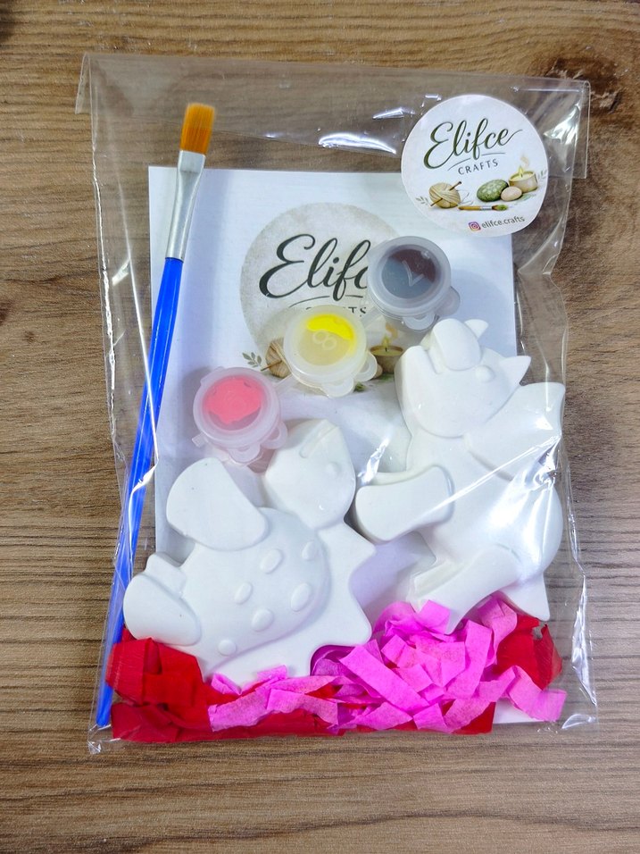 Bu çocuk el sanatları setinde beyaz taş tozu figürler, üç boya kabı ve bir fırça bulunur. Renkli kağıt parçaları ve Elife Crafts markasıyla paketlenmiştir. 2 Adet Büyük Obje 3 Ayrı Renk Boya Boyama Fırçası