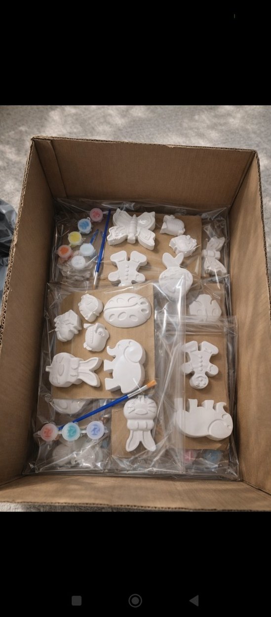 Beyaz taş tozu figürler ve küçük boya kutuları ile fırçalar içeren boyanabilir set. Hayvan ve nesne şekilleri bulunur.