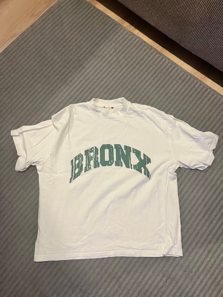 Pamuk kumaştan, kısa kollu, beyaz renkte ve BRONX baskılı erkek tişört. Salaş kesimi ve yuvarlak yakasıyla spor ve sokak stiline uygun.