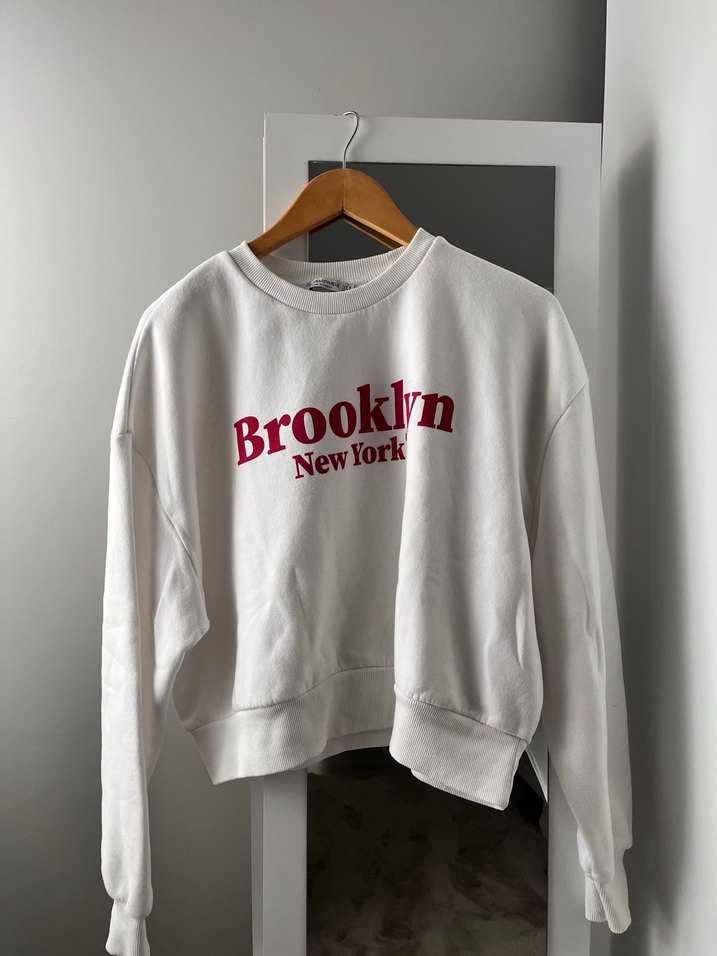 Pamuklu, uzun kollu, yuvarlak yaka, bol kesim beyaz sweatshirt üzerinde 'Brooklyn New York' baskısı ile rahat ve şık bir sokak stili Tertemiz,orijina ürün. Pamuklu ve oversıze model. Göğür:67cm b boy:52cm #stradivarius #zara