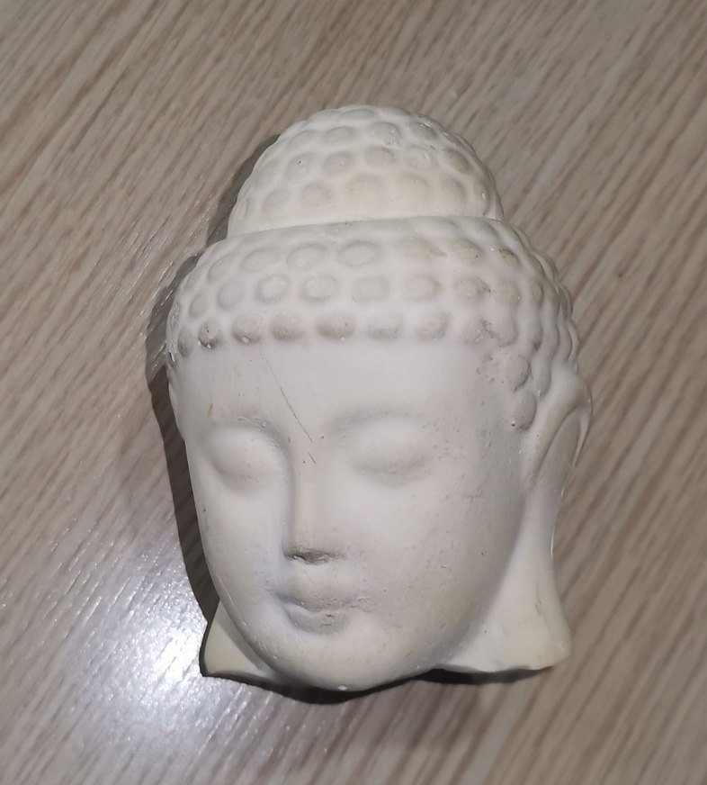 Detaylı yüz hatlarına sahip beyaz ve gri Buda figürini, pürüzsüz bir malzemeden yapılmıştır. Sakin ve spiritüel bir hava katar.