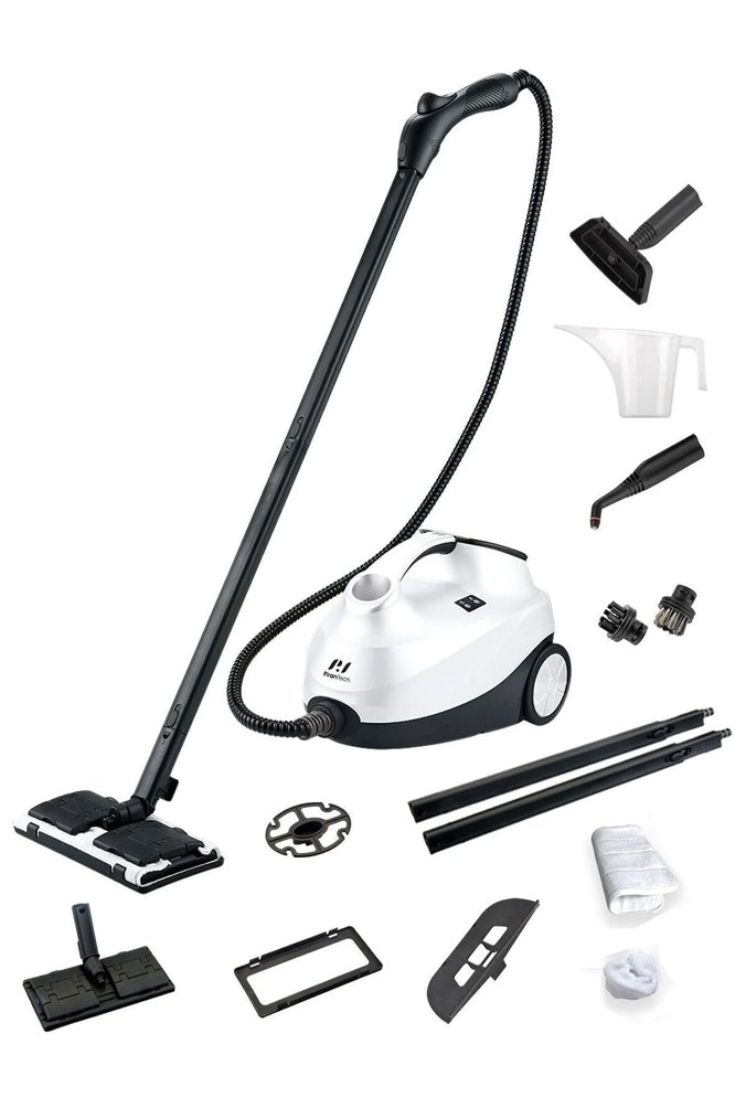 Beyaz buharlı temizleyici, çeşitli fırçalar, başlıklar ve uzatma çubukları ile çok yönlü temizlik sağlar. Ölçü kabı ve bez aksesuarları dahildir.