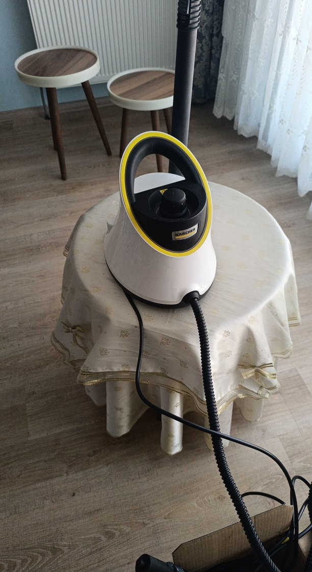 Siyah ve sarı kulplu beyaz buharlı temizlik robotu Kompakt ve kullanımı kolay. ⚡