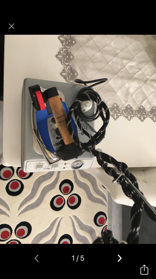 Kontrol düğmeli beyaz buharlı ütü, dayanıklı koyu renk örgülü kablo ve rahat tutma sapına sahiptir. Düğmesinde bir sorunu olduğu için buhar çıkışı yapamıyor bende kullanmadığım için yaptırmadım fiyatı makul tutuyorum onun için pazarlık vardır