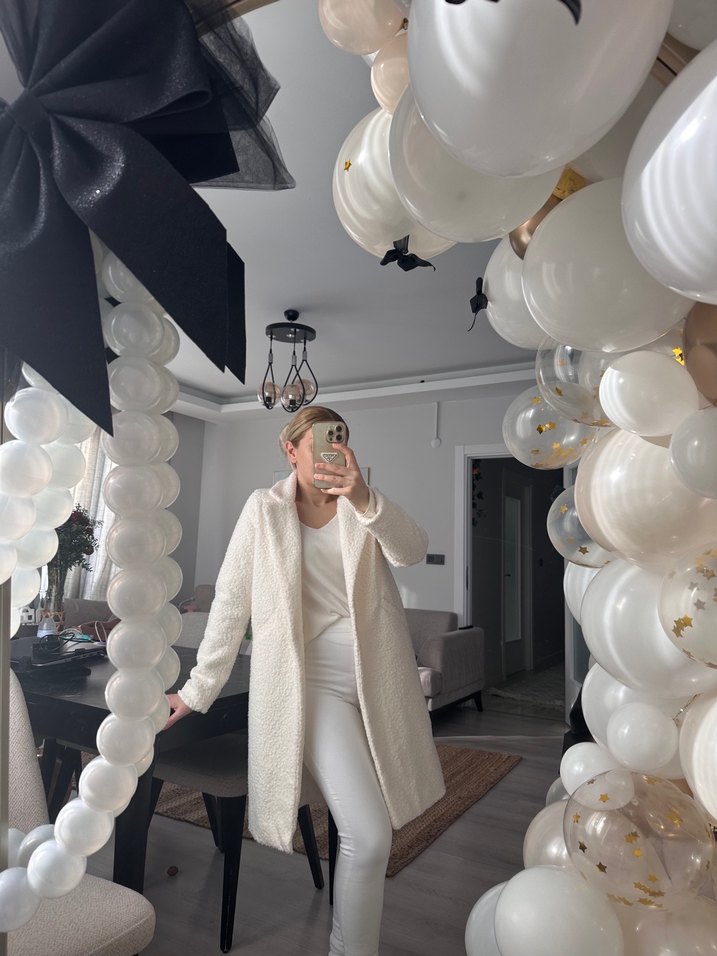 Bu beyaz yün kaban, kürklü detayları, uzun kolları ve geniş kesimi ile rahat ve normcore tarzda günlük kullanıma uygundur. Kunaşı buklettir sadece 1 defa kullanıldı❄️