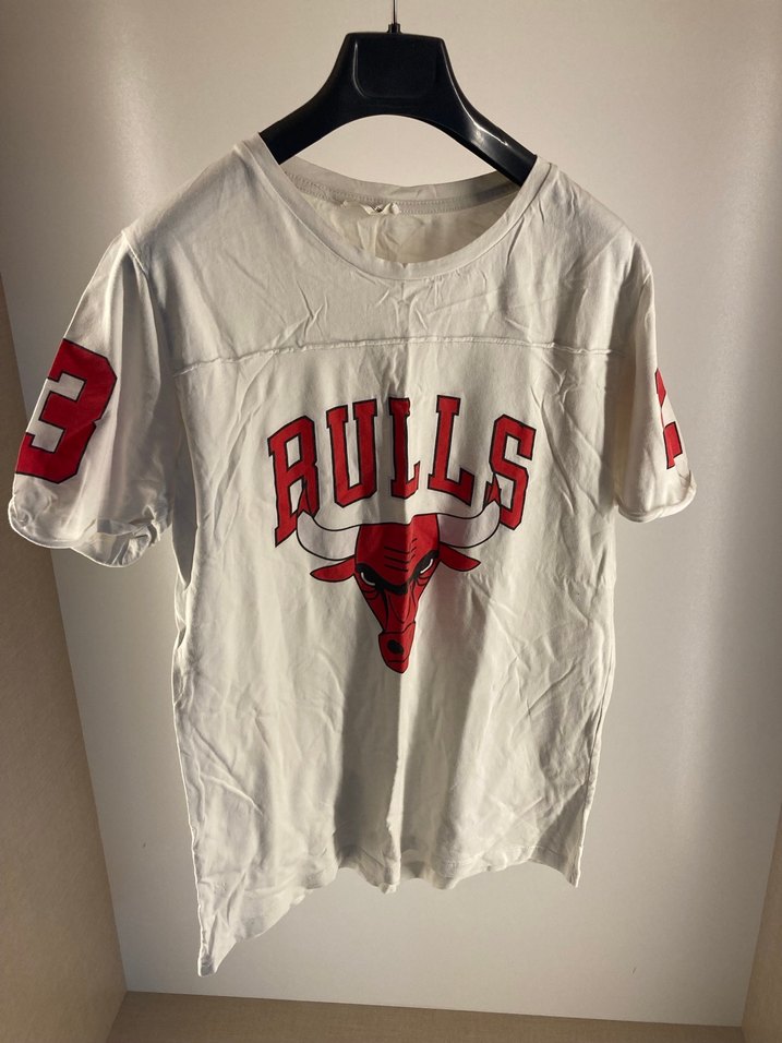Pamuklu, beyaz renkli tişörtü, kısa kollu ve yuvarlak yaka. Önünde ve kollarında baskılı Bulls logosu ve 23 numarası bulunur. Rahat kesimiyle spor şıklık sunar.
