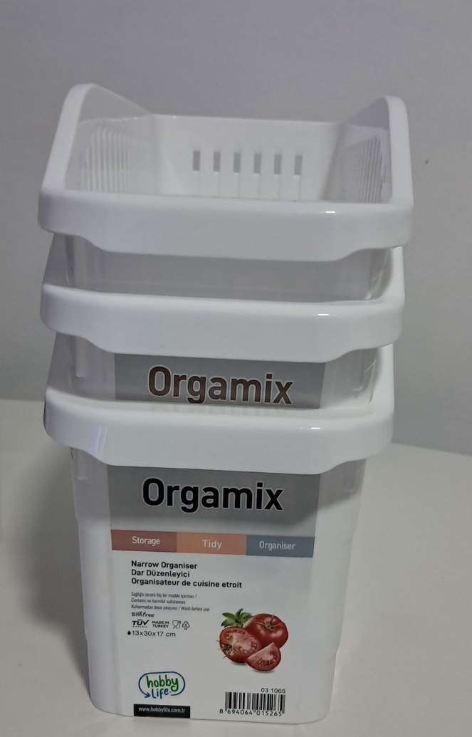 Beyaz renkte saklama kabı, düzenli ve havalandırmalı tasarıma sahiptir. 13×30×17cm'dir. 3 adet mevcuttur.