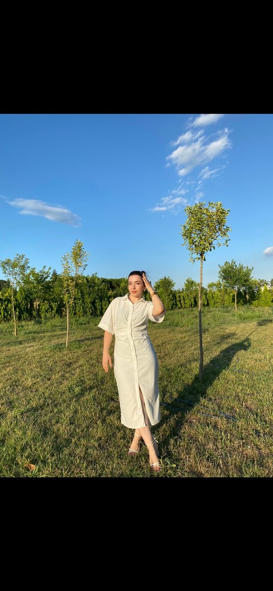 Beyaz, uzun boylu elbise yüksek yakalı ve kısa kolludur. Pamuk kumaştan yapılmış, bol kesimiyle rahat ve şık bir görünüm sunar. Kusuru yoktur