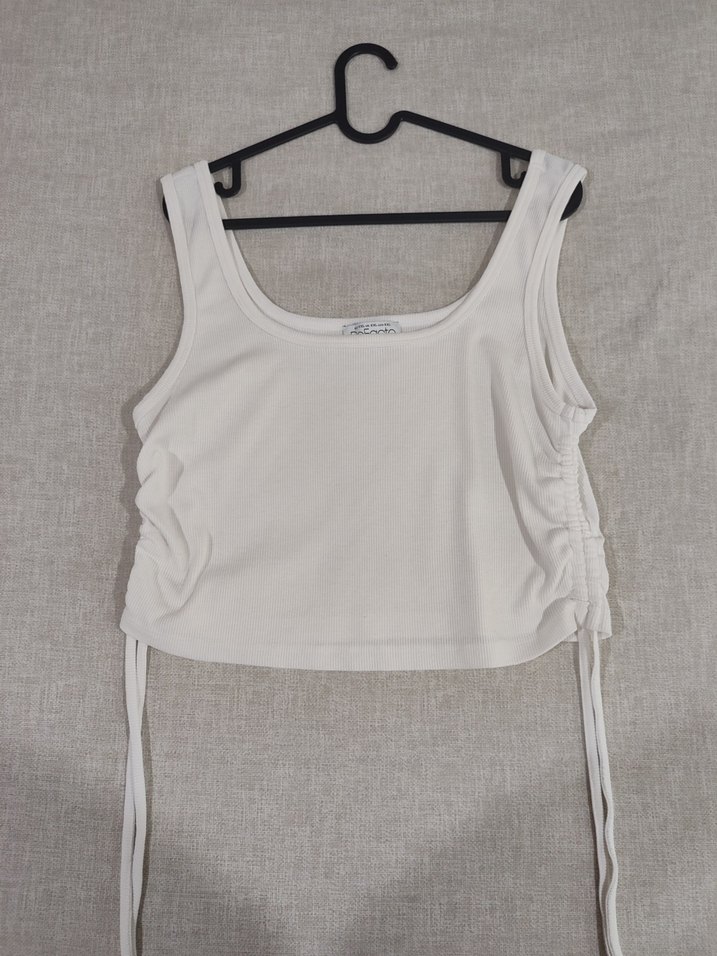 Yumuşak keten kumaştan, yanları büzgülü ve ayarlanabilir bağcıklı beyaz kolsuz atlet, rahat ve şık sokak tarzı sunar.