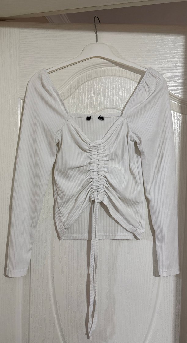 Beyaz, uzun kollu, tekne yaka ve büzgülü detaylı, ince kumaştan yapılmış kadın bluz. Günlük kullanıma uygun şık ve rahat bir parça.