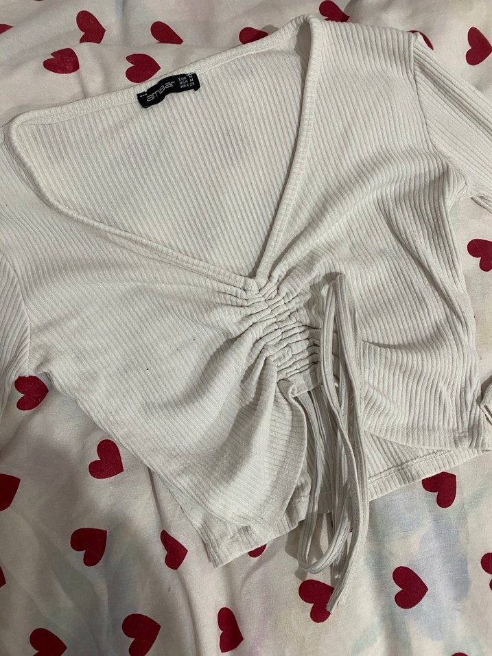 Beyaz, büzgülü V yakalı, kısa askılı ve nakış detaylı kadın bluz. Yumuşak sentetik kumaştan, rahat sokak stili için uygundur.